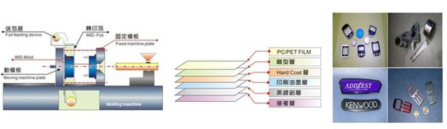 將印刷完成的薄膜利用不同型式置入模具,經射出成型后,得到具有印刷質感之成型,結合產品設計、模具技術部與傳統(tǒng)后加工技術為一體的制程技術。主要應用材料包含片材、樹脂、油墨三部分。