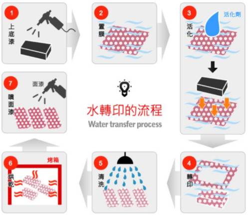 水轉印是種通過水的作用,將平面印刷的圖文轉印至不同材質物體表面的技術。水轉印又分為水標轉印與水披覆轉。ㄇ媾玻﹥煞N,水標轉印主要用于文字與寫真圖案的轉印,水披覆轉印則主要用于在整個物體表面進行完整的轉印。